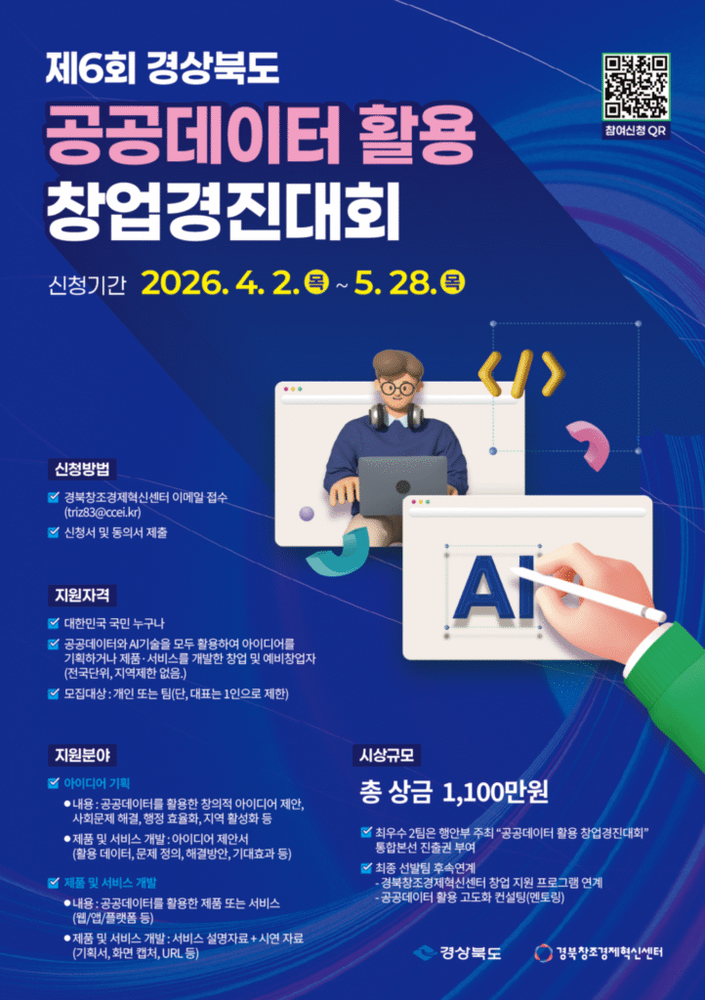경북창조경제혁신센터가 경상북도와 공동으로 ‘제6회 경상북도 공공데이터 활용 창업경진대회’ 참가자를 모집한다고 7일 밝혔다. 이번 대회는 공공데이터와 인공지능(AI) 기술을 결합해 사회 문제를 해결하고 행정 효율성을 높일 수 있는 창의적인 아이디어와 제품·서비스를 발굴하기 위해 마련됐다. 공모 분야는 ▲공공데이터를 활용한 창의적 아이디어 기획 부문 ▲실제 제품·서비스 개발 부문 등 2개로 나뉜다. 대한민국 국민이라면 누구나 지역 제한 없이 개인 또는 팀 단위로 참여할 수 있다. 접수 기간은 4월 2일부터 5월 28일까지이며, 서류 및 발표 심사를 거쳐 최종 12개 팀을 선정한다. 총상금 규모는 1,100만 원이며, 대상 1팀에게는 경상북도지사상과 상금 300만 원이 수여된다. 또한 부문별 최우수 2개 팀에게는 행정안전부 주최 ‘제14회 범정부 공공데이터 활용 창업경진대회’ 통합 본선 진출권이 주어진다. 수상팀에게는 경북창조경제혁신센터의 창업지원 프로그램 연계, 전문가 1:1 멘토링, 데이터 고도화 컨설팅 등 사업화 후속 지원도 제공된다. 유주현 경북창조경제혁신센터 대표는 “공공데이터는 디지털 전환 시대의 핵심 원천”이라며 “참신한 아이디어와 우수한 AI 기술력을 가진 창업가들이 이번 대회를 통해 글로벌 경쟁력을 갖춘 기업으로 성장할 수 있도록 적극 지원하겠다”고 말했다. 자세한 모집 요강과 신청 방법은 경북창조경제혁신센터 홈페이지에서 확인할 수 있다. Welaunch 서아림 기자 스타트업 뉴스 플랫폼, 위런치 © 2024 Welaunch. All Rights Reserved 보도자료/기고 : editor@welaunch.kr 광고/제휴 문의: we@welaunch.kr
