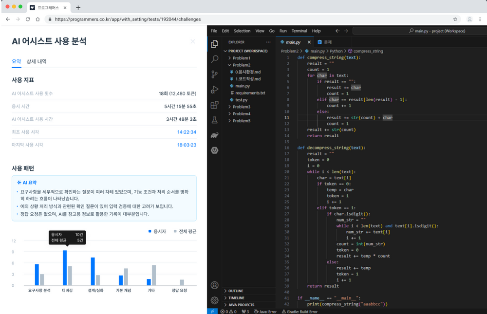 - 상세 리포트 제공 : AI 활용 패턴, 문제 해결 과정, 코드 품질, 논리적 사고력 등을 종합 분석한 리포트 자동 생성.