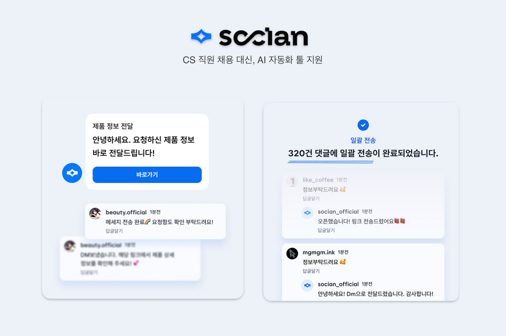 스타트업∙딥테크 전문 미디어 위런치(Welaunch)가 AI 기반 인스타그램 DM·댓글 자동화 솔루션 소시안(Socian)과 손잡고 ‘2026 스타트업 SNS 운영 효율화 지원 캠페인’을 시작한다고 3일 공식 밝혔다. 이번 캠페인은 단순 광고나 할인이 아닌, 초기 스타트업들이 가장 큰 고충으로 꼽는 ‘고객 문의(DM·댓글) 응대 부담’을 실질적으로 해결해주는 ‘지원사업 형태’의 협업 프로젝트다. 위런치 독자 중 인스타그램 공식 계정을 운영하는 초기 스타트업이라면 누구나 신청할 수 있으며, 선착순 100팀에게 소시안 최상위 플랜 ‘Plan C’ 1개월 무상 이용권을 전액 지원한다. 캠페인 슬로건은 “CS 직원 채용 대신, AI 자동화 툴 지원”이다. 초기 스타트업은 제품·서비스 개발에 집중해야 할 시간에 DM·댓글 응대에 묶여 있는 경우가 많지만, 전담 인력을 뽑을 여력은 부족하다. 특히 인스타그램을 활용한 공구·라이브커머스·패션·뷰티 셀러들은 댓글 하나가 매출로 직결되기 때문에 놓치는 문의가 곧 기회 손실이다. 소시안은 기존 자동화 서비스의 한계를 넘어 ‘업로드 전후 전체 댓글’을 실시간 감지해 자동 DM을 발송하는 기술로 차별화된다. 게시글 올리기 전부터 달린 문의 댓글 및 특정 키워드를 놓치지 않고 즉시 응대하며, 키워드·팔로워 여부에 따라 메시지를 세밀하게 분기할 수 있다. GPT 기반 캡션 자동 생성, 일괄 전송, 스팸 차단 피하는 ‘Smart Queue’ 알고리즘 등으로 셀러들의 반복 업무를 완전히 대체한다. 소시안 서비스 관계자는 “많은 셀러가 소수의 대형 크리에이터에만 의존하는 불안정한 구조를 갖고 있다”며 “단순 프로모션이 아닌 실질적인 인력·비용 절감 솔루션을 무상으로 제공함으로써 초기 스타트업들의 SNS 마케팅 및 커머스 생태계에 진짜 도움이 될 것으로 기대한다”고 강조했다. 캠페인 신청은 위런치 뉴스레터·홈페이지 배너·SNS 채널을 통해 공고되며, 전용 구글폼에서 간단한 신청서만 작성하면 된다. 캠페인 시작 후 신청 선착순으로 소시안 쿠폰 코드가 즉시 적용되며, 바로 사용 가능하다. 현재 2월 한정 프로모션으로 선착순 100팀(1기) 모집은 조기 마감될 가능성이 높다. 빠르게 지원한 초기 팀중 선발하여 언론 홍보 및 마케팅 지원, 개발자 채용 홍보 지원도 제공할 예정이다. 위런치는 향후 소시안과 같은 스타트업과 다양한 협업을 통해 기술과 서비스를 알리고 성장시키는 스타트업의 실질적인 성장 파트너 역할을 지속적으로 진행해 나가겠다고 밝혔다 Welaunch 서아림 기자 스타트업 뉴스 플랫폼, 위런치 © 2024 Welaunch. All Rights Reserved 보도자료/기고 : editor@welaunch.kr 광고/제휴 문의: we@welaunch.kr