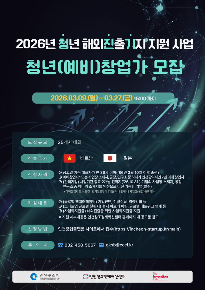 인천창조경제혁신센터, ‘2026년 청년 해외진출기지 지원 사업’ 참가 청년 창업가 모집