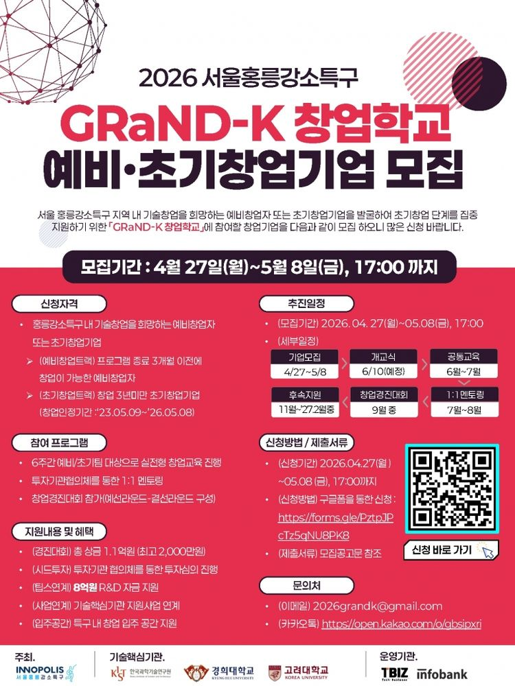 인공지능(AI) 및 지식재산권(IP) 기반 액셀러레이터(Accelerator, 창업기획자) 인포뱅크(Infobank, 대표 박태형)가 서울홍릉강소특구, 티비즈와 함께 바이오헬스 및 딥테크(Deep-tech, 첨단기술) 분야 혁신 스타트업을 육성하는 ‘2026 GRaND-K(그랜드 케이) 창업학교’ 참여기업 60개 팀을 오는 5월 8일까지 모집한다.