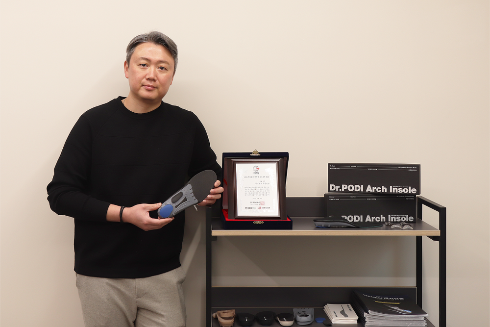 수상 핵심 기술은 ‘단계별 교정 아치블록 시스템(셀프 아치 블록 시스템)’으로, 사용자가 자신의 발 아치 높이에 맞춰 직접 높이를 선택·조절할 수 있도록 설계됐다. 병원 맞춤형 인솔 대비 접근성과 활용성을 대폭 높인 점이 높이 평가받았다.