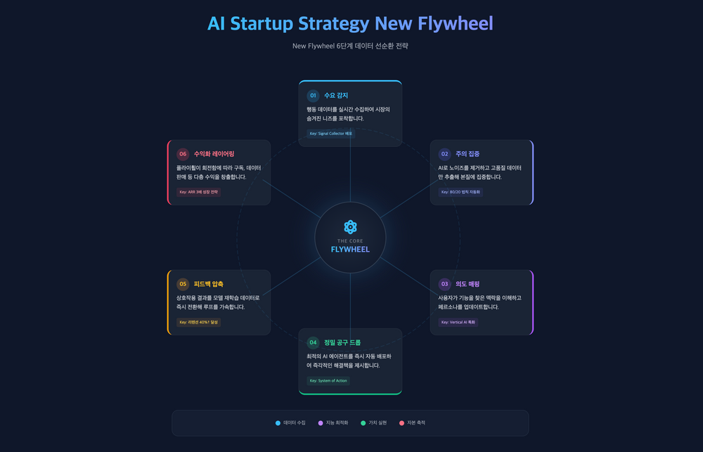 이 전략은 '수요 감지 → 주의 집중 → 의도 매핑 → 정밀 공구 드롭 → 피드백 압축 → 수익화 레이어링'의 6단계로 구성되며, AI를 단순 도구가 아닌 '자동 실행 시스템'으로 활용해 경쟁 우위를 구축한다. 스타트업은 이 플라이휠을 통해 초기 데이터 부족 문제를 극복하고, 사용자 규모가 커질수록 제품이 스스로 강해지는 구조를 만든다.