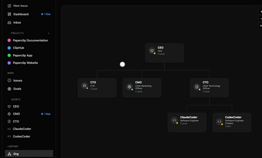 Paperclip(페이퍼클립)은 Node.js 서버와 React 대시보드로 구성된 오픈소스 프레임워크다. 사용자가 사업 목표를 입력하면 최상위 에이전트(CEO 역할)가 목표를 분해하고, 전문화된 서브 에이전트를 ‘채용’해 업무를 배분·관리·감독한다. 조직도, 예산, 거버넌스, 목표 정렬, 비용 추적 등 기업 운영에 필요한 구조를 모두 제공한다.